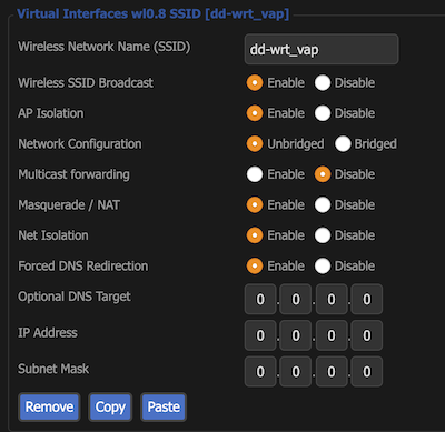 Router-B runs DD-WRT firmware in the Gateway mode. The basic setup itself is a straight forward adaptation of Guest Wi-Fi setup on dd-wrt wiki. Basically, Wireless > Basic Settings > new Virtual interface with AP Isolation enabled, and running a Unbridged network configuration with NAT, Net Isolation and DNS redirection enabled. In addition, I have a VLAN setup for LAN B3 with one of the physical LAN ports on the router. Similar configuration for the VLAN, can be configured under Setup > Networking. The IP Address/subnet here will be that of the interface, eg. 10.x.y.z/24. At the bottom of Setup > Networking > DHCPD, I setup a different DHCPD for each of the WLANs, and VLAN.